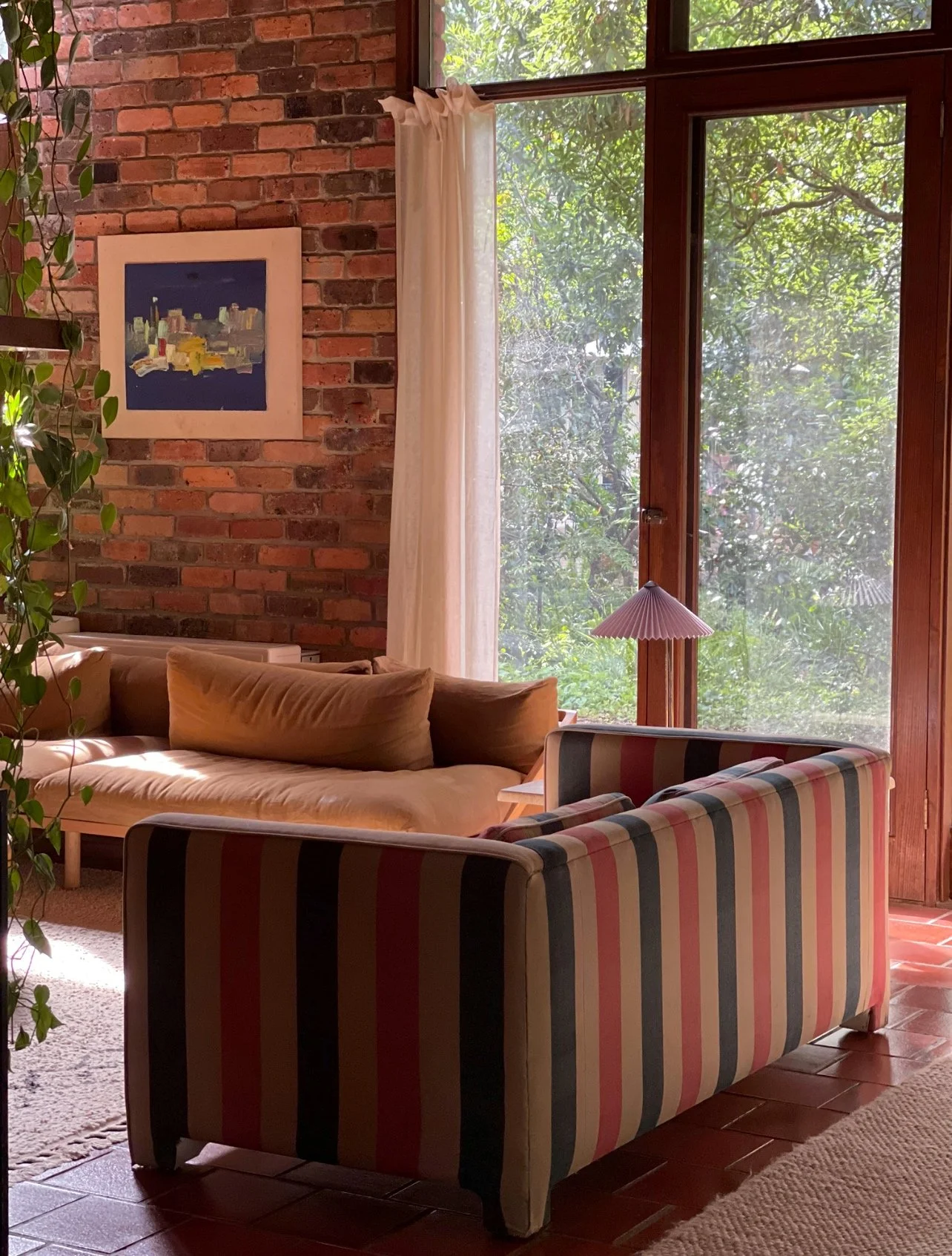 in great condition. very minimal wear to the timber frame for their age. the fabric is a beautiful new stripe linen freshly reupholstered. seats designed to sit within the frame.